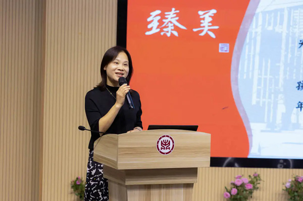 ▲江阴市实验小学教育集团党总支书记、校长夏静洁介绍学校艺术教育的特色路径