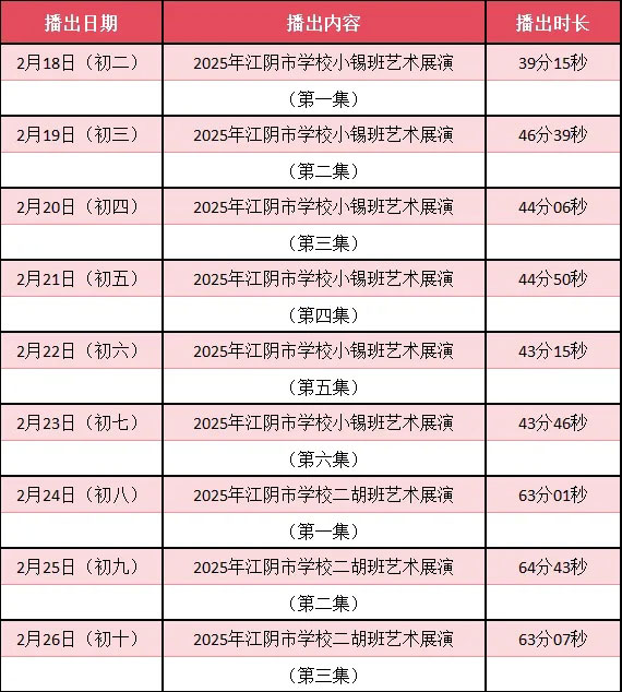 为进步擦亮江阴地方特色文化品牌,充分发挥“以美育人”功能,打造阳光活力校园,集中展示我市学校“小锡班”“二胡班”建设成果,2026春节期间,江阴电视台社会经济频道推出我市小锡班和二胡班的专题汇报演出。播:社会经济频道19:50;重播:社会经济频道13:30左右;民生频道13:15左右。同时,广大市民还可通过“江苏有线”4K机顶盒点击“本地”——“地方戏曲”点播观看。