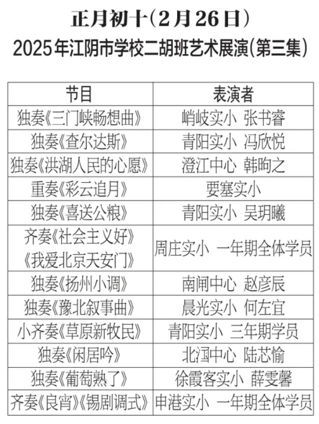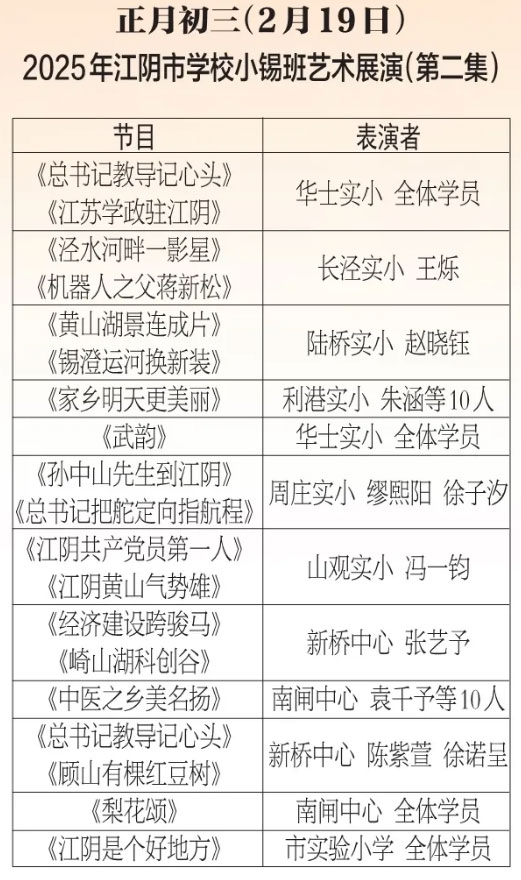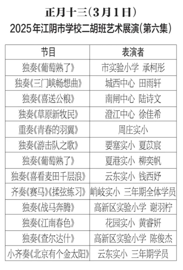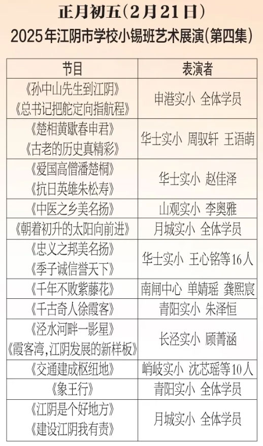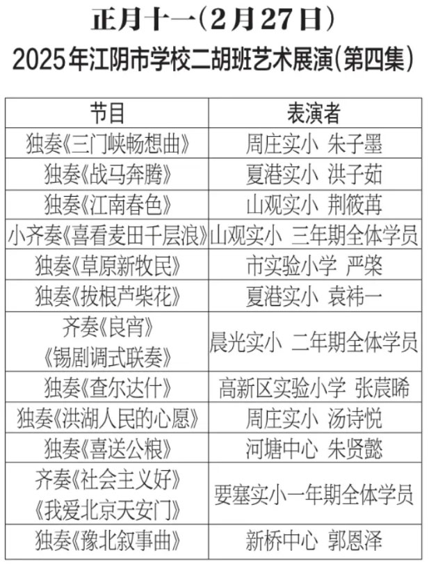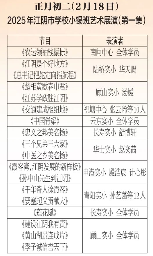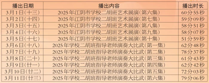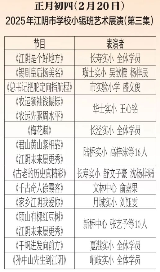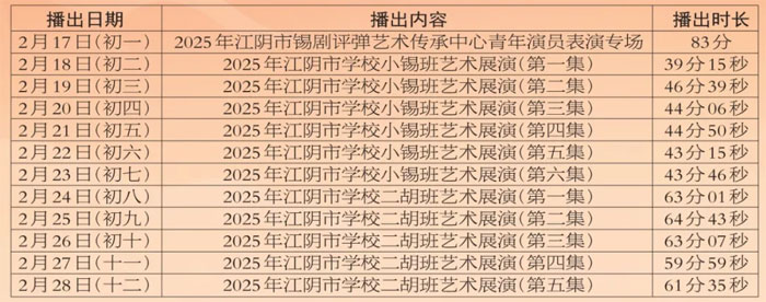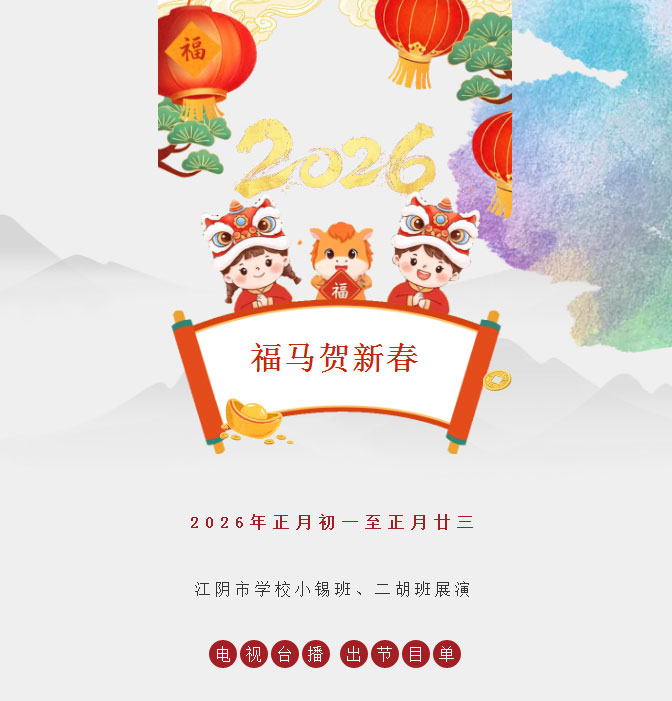 为进步打造江阴地方特色文化品牌,持续推进江阴文化的传承与发展,展示我市学校“小锡班”与“二胡班”的建设成果,从2026年2月17日至3月11日(正月初开始至正月廿三),江阴电视台社会经济频道推出每天一期小锡班和二胡班的专题汇报演出。播:社会经济频道19:50;重播:社会经济频道13:30左右;民生频道13:15左右。同时,广大市民还可通过“江苏有线”4K机顶盒点击“本地”——“地方戏曲”点播观看。