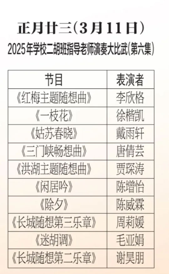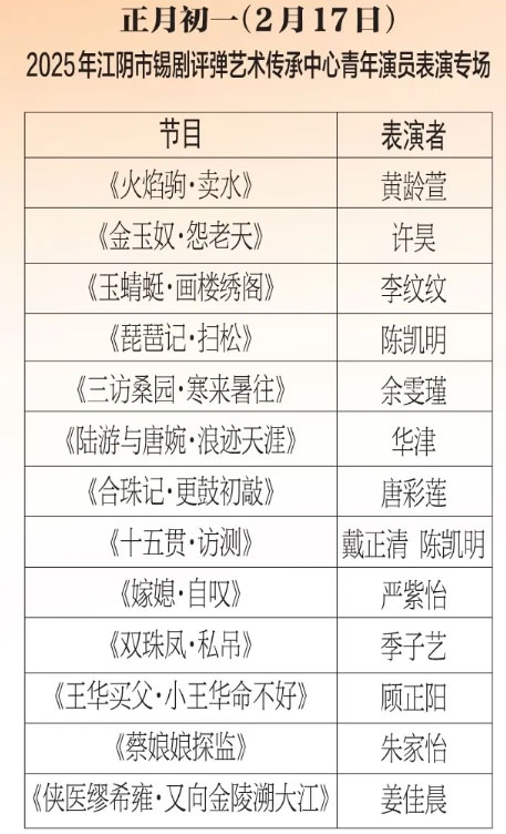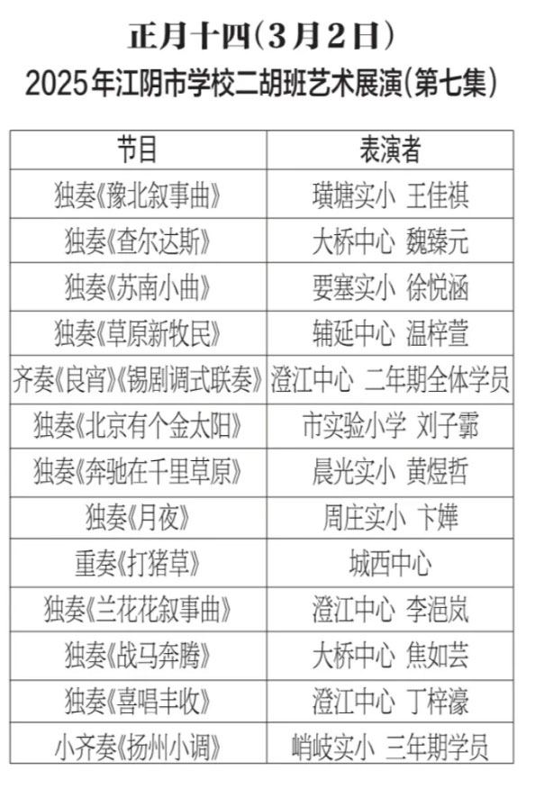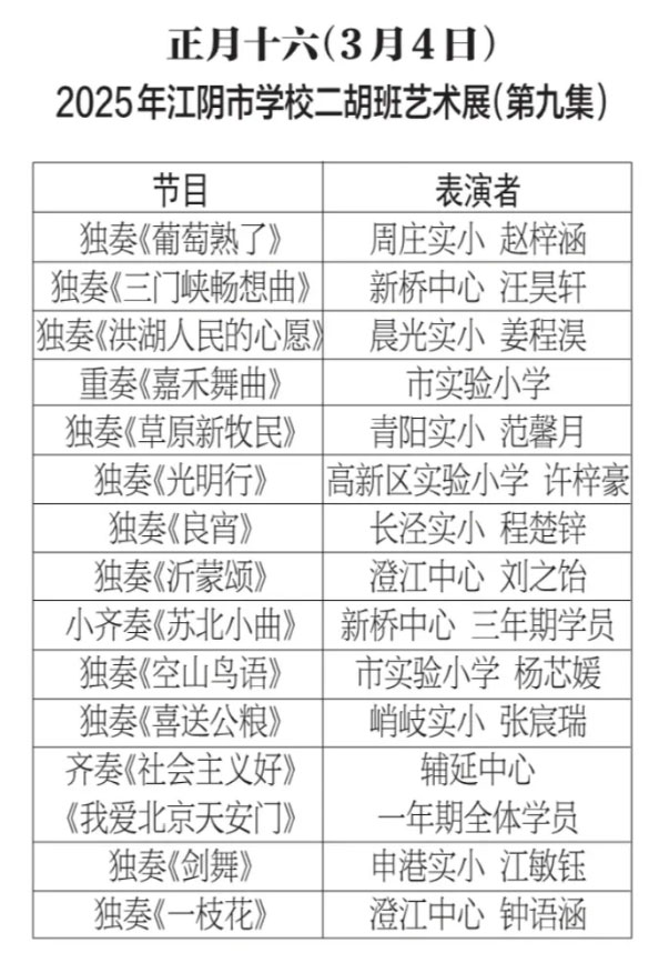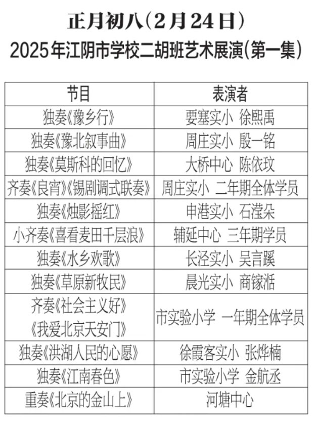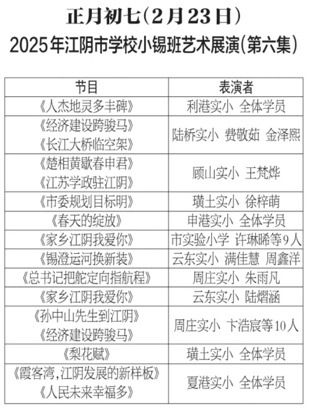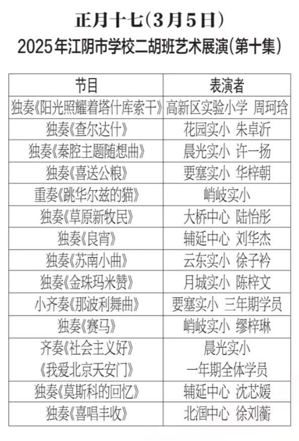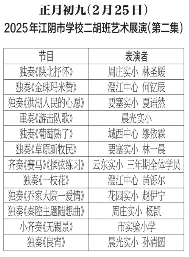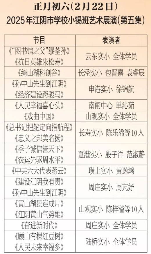 为进步打造江阴地方特色文化品牌,持续推进江阴文化的传承与发展,展示我市学校“小锡班”与“二胡班”的建设成果,从2026年2月17日至3月11日(正月初开始至正月廿三),江阴电视台社会经济频道推出每天一期小锡班和二胡班的专题汇报演出。播:社会经济频道19:50;重播:社会经济频道13:30左右;民生频道13:15左右。同时,广大市民还可通过“江苏有线”4K机顶盒点击“本地”——“地方戏曲”点播观看。